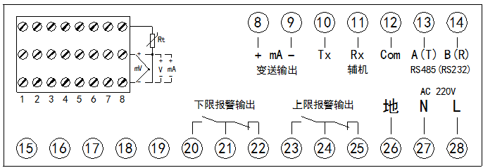 報警輸出:(1)1-64通道統一上下限報警,繼電器輸出觸點容量 AC220V/3A