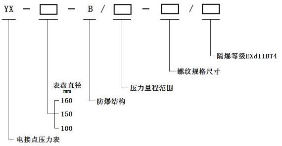 YX-160B(150B 100B)防爆電接點壓力表的工作原理是基于檢測元件(測量系統中的彈簧管)的彈性變形,通過機械傳動使之帶動電接點組中的觸頭產生相應的動作(閉合或斷開)以使控壓系統中的電路得以接通或斷開,從而實現自動控制報警和現場指示的目的。